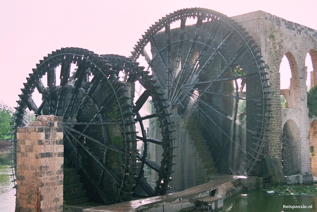 Maar we gingen naar Hama. Voor het eerst is er een mooi modern busstation. Tot nu toe waren het van die enorme gore chaotische mierenhopen, hier is het georganiseerd en rustig. In Hama een kamertje gezocht en dan een rondje door de stad gelopen. De Reden om naar Hama te komen zijn de waterraderen waarvan er hier nog een aantal draaien in de rivier. Er staan er een stuk of acht verspreid door de stad. In het centrum is er ook een stadspark aangelegd wat er heel fraai uit ziet. Hier geen verdroogde dennen zoals elders maar bomen vol bloemen. Heel geschikt om even te lunchen en dat doen we dus ook uitgebreid. Met uitzicht op een van de radaren die trouwens een enorm lawaai maken, een soort gegrom wat alles overstemt...