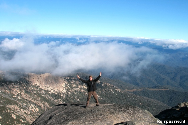 Dan gaan we weer de bergen in, de Australische Alpen! Als eerste naar Mt.Buffalo een hooggelegen nationaal park. Echt een heel fraai park. Er hangt een zilveren gloed over de heuvels van alle kale boomstammen die als prikkertjes uit het groen omhoog steken. Ook hier hebben ze een jaar of wat geleden (enorme) bosbranden gehad en alle bomen zijn doodgegaan door de hitte. Vreemd genoeg zijn ze niet zwartgeblakerd, maar heeft het hout een zilverachtige kleur. Gelukkig groeit het al weer enorm en ziet het ook al weer “gewoon” groen.