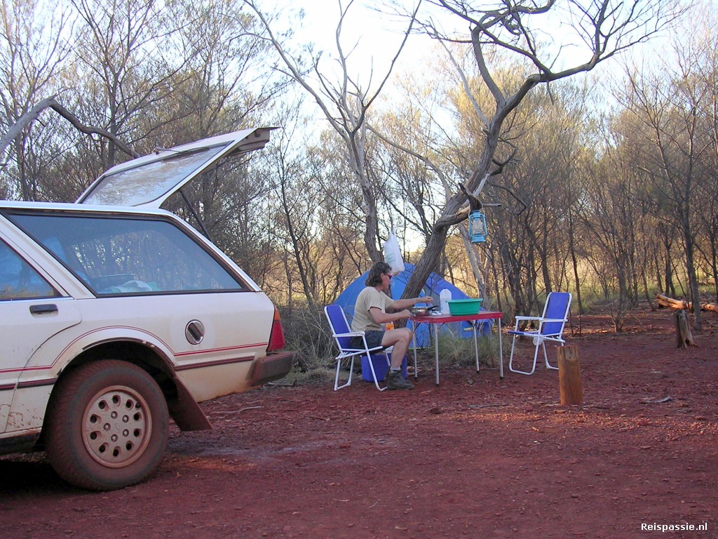 Gekampeerd op een van de campings in het park. s' Avonds wordt het doodstil en hoor je de dingo's in de verte (al lijkt het heel dichtbij) huilen. We staan vlakbij een rivier en zo gauw als het begint te schemeren komen er duizenden muggen. Werkelijk HEEL irritant. We waren heel snel klaar met eten en zijn maar de tent ingevlucht en hebben de wereld van achter het muggengaas bekeken.
