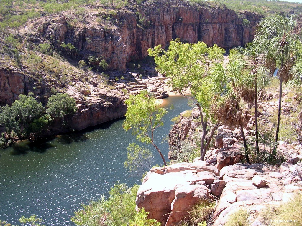 Katherine is een prettig klein outback stadje. Behoorlijk groen door de rivier die door het dal stroomt. Overigens schijnt diezelfde rivier hier nogal eens voor behoorlijke problemen te zorgen want bij het plaatselijke winkelcentrumpje hangen foto's waarbij het water tot aan de dakgoot staat. Maar niet vandaag, het is gortdroog en geen wolkjes dus waarschijnlijk ook geen regen en dus ook geen overstromingen.