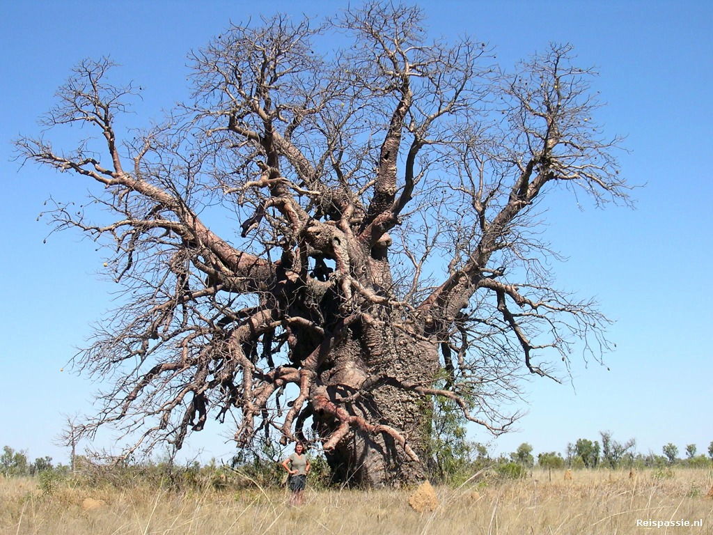 De dag er na naar Fitzroy crossing. We rijden nu langs de Kimberley, een groot national park. Dwars hier doorheen loopt ook een weg en in eerste instantie hadden we gehoopt om met onze auto hier langs te kunnen. Maar we hoorden al van verschillende kanten dat de weg nu erg slecht is en dat 4WD's er zelfs niet ongehavend doorheen kwamen. Dus we rijden er maar omheen want ons wagentje moet als het even kan nog een eindje mee. En de uitlopers van de Kimberley waar we nu doorheen rijden zijn ook erg fraai. Grote Boab bomen staan langs de weg. Ze zien er een beetje uit als de bomen uit sprookjesboeken, ze lijken elk moment tot leven te kunnen komen en aan de wandel te kunnen gaan. Hier onderweg veel branden gezien. Ze zijn al van heel ver te zien door de rookwolken tegen de verder blauwe hemel. Je rijdt soms links en rechts tussen de vlammen door. Grote zwartgeblakerde stukken. Maar het lijkt allemaal z'n gangetje te gaan. Niemand stopt en nergens wordt geblust, kennelijk dooft het vanzelf weer.