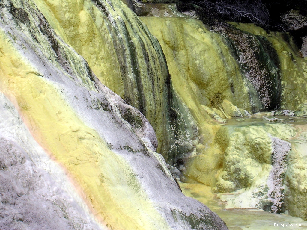 De dag er op 's ochtends vroeg eerst weer even een duik genomen. Daarna naar het dichtbij gelegen Wai-o-tapu. Ook dit is een thermisch gebied vol met geisers modderpoelen en bronnen in de meest prachtige kleuren. We bezoeken eerst de geiser. Deze wordt met de hand "opgestart". Door het toevoegen van een paar blokken zeep wordt de oppervlakte spanning van het koude water afgehaald waardoor het hete water uit het ondergelegen reservoir vrijkomt. Het reservoir bevat iets van 20000 liter wat dan onder hoge druk omhoog komt. En dus een mooi fonteintje als het boven de grond komt. We grappig om te zien dat voor dat de geiser losbreekt er eerst een enorme berg schuim uit tevoorschijn komt. Het schijnt dat ze deze geiser ook bij toeval ontdekt hebben toen er ooit een paar mensen in het hete water de was gingen doen. Die zullen zich aardig wezenloos geschrokken zijn!