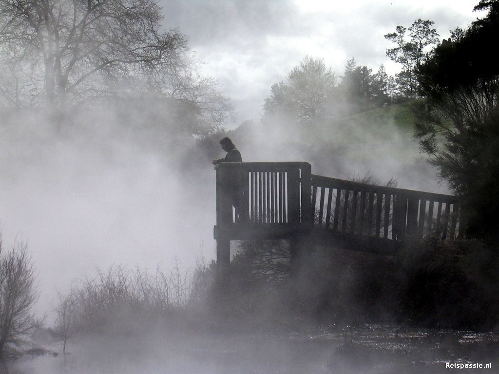 We internetten nog even in het centrum en gaan dan naar de Waikite valley. Dit is een gebied in de buurt waar ook veel heetwaterbronnen zijn en er is een camping met z'n eigen heetwater baden. Het is prachtig om te zien hoe in de hele vallei overal stoompluimen omhoog stijgen. Bij de camping hebben ze inderdaad twee baden die gevoed worden uit een hete bron. Het water uit de bron is 98 graden en wordt afgekoeld tot een graad of 37 voordat het de baden in gaat. Overal over de camping lopen riviertjes uit de bron met een grote stoomwolk er boven. We gaan eerst eten en om een uur of acht 's avonds zwemmen. Heerlijk water, heel zacht. En buiten is het al aardig afgekoeld zodat ook het zwembad aardig begint te dampen. Tel hierbij de sterrenhemel en de schaarse verlichting en het is een bijzonder avondje zwemmen.