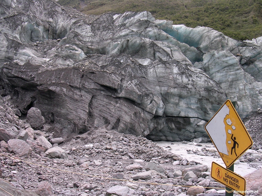 De volgende dag vervolgen onze weg naar de gletsjers. We gaan eerst naar de Fox gletsjes. De gletsjers zijn hier nogal speciaal t.o.v. andere in de wereld omdat ze gewoon tot in het regenwoud lopen. En ze zijn ook heel toegankelijk. We lopen tot de voet van de gletsjer. Er zitten nog wat stukken mooi blauw ijs tussen maar het meeste is al grauw van gruis en stenen. Daarna naar de Franz Josef gletsjer een half uurtje rijden verderop. Hier is het wat langer lopen naar de voet. Je kan wel tot op het ijs komen. Er lopen in de verte groepen met gids tussen de schotsen. Deze gletsjer is wel mooier dan de Fox. Meer helder ijs en je kan tot ver op de berg de gletsjer volgen waar hij bij de Fox al vrij snel de hoek om gaat. Hier een tijdje doorgebracht.