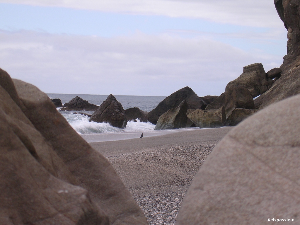 Bij het strand aangekomen zijn we de enige in de baai. We zoeken een plekje tussen de rotsen en wachten af. Maar een half uurtje later is het strand nog steeds verlaten en dus geen pinquin te zien. Als we langzaam terug sjokken komen ze opeens uit de branding rollen. Ze peddelen als een bezetene om uit het terugstromende water te komen en lopen een stukje richting strand en worden dan weer gegrepen door de volgende golf. Dit herhaald zich een paar keer totdat ze eindelijk op het droge staan.