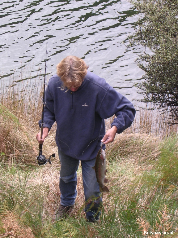 De volgende dag eerst weer naar Queenstown gegaan. Internet is hier lekker goedkoop dus even de boel bijwerken. Dachten we... Helaas is het zo traag dat we van ellende maar gestopt zijn. Een andere keer beter. Dan een stukje langs het enorme Wakatipu meer gereden naar het vertrekpunt van de Dispute wandeling. De wandeling gaat een stuk de bergen in naar het Dispute meertje. Onderweg mooie uitzichten op het grote Wakatipumeer. De hengel hebben we meegesjouwd want in het Disputemeer schijnt het goed vissen te zijn. We vangen weer een mooie grote regenboogforel.