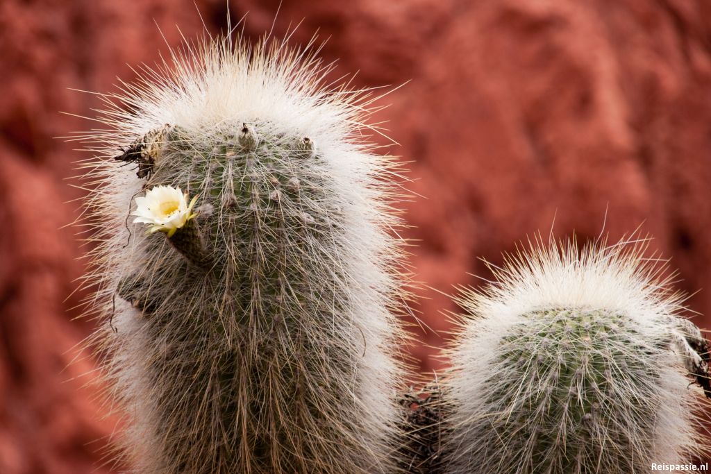 Een dag later een bus gepakt naar Uquia, een gehucht op tien minuten rijden van Humahuaca. Hier een lange wandeling gemaakt door een kloof achter het dorpje. We volgen de rivierbedding omhoog de kloof in. Het is een gortdroge omgeving. Gelukkig is het vandaag bewolkt zodat het met de temperatuur wel meevalt. Ondanks dat het zo'n droge omgeving is groeit en bloeit er toch van alles. Het meeste klein en met enorme stekels. De enorme cactussen staan er ook weer. Vaak hele groepen bij elkaar.