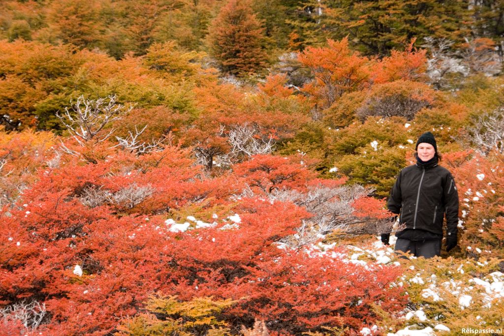 We gaan naar het uitzichtpunt op de Fitz Roy lopen. Ook vandaag weer een prachtige route langs beken omzoomt met bomen en struiken in de prachtigste kleuren. Naar mate we verder de vallei ingaan neemt de hoeveelheid sneeuw snel toe. We lopen in een geheel witte wereld.