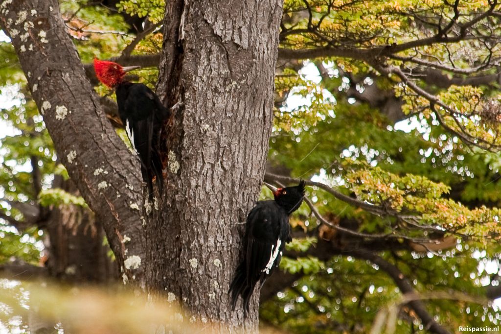 Na een uur of twee begint het weer te waaien en te sneeuwen. Wordt gelijk weer lekker koud. We lopen nog een half uurtje tot een splitsing met mooi uitzicht, tenminste als het helder is. Nu valt er niets te zien en we gaan vanaf hier weer terug. Het heeft niet veel zin om tot het hoogste punt te gaan als er nul zicht is. Op de terugweg zien we twee koppeltjes Patagonische spechten. Het mannetje is geheel zwart met een felrode kop. Mooi gezicht. Ze zitten de bast van de bomen te wrikken op de insecten er achter te pakken.
