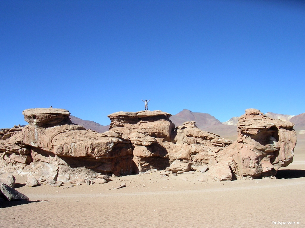 Na een uurtje komen we bij een verzameling grillige rotsen, uitgesleten door de zandstormen, Arbol de Piedra.. Grote rotsen die soms op een heel smal voetje staan. Eentje beklommen voor een mooi uitzicht.