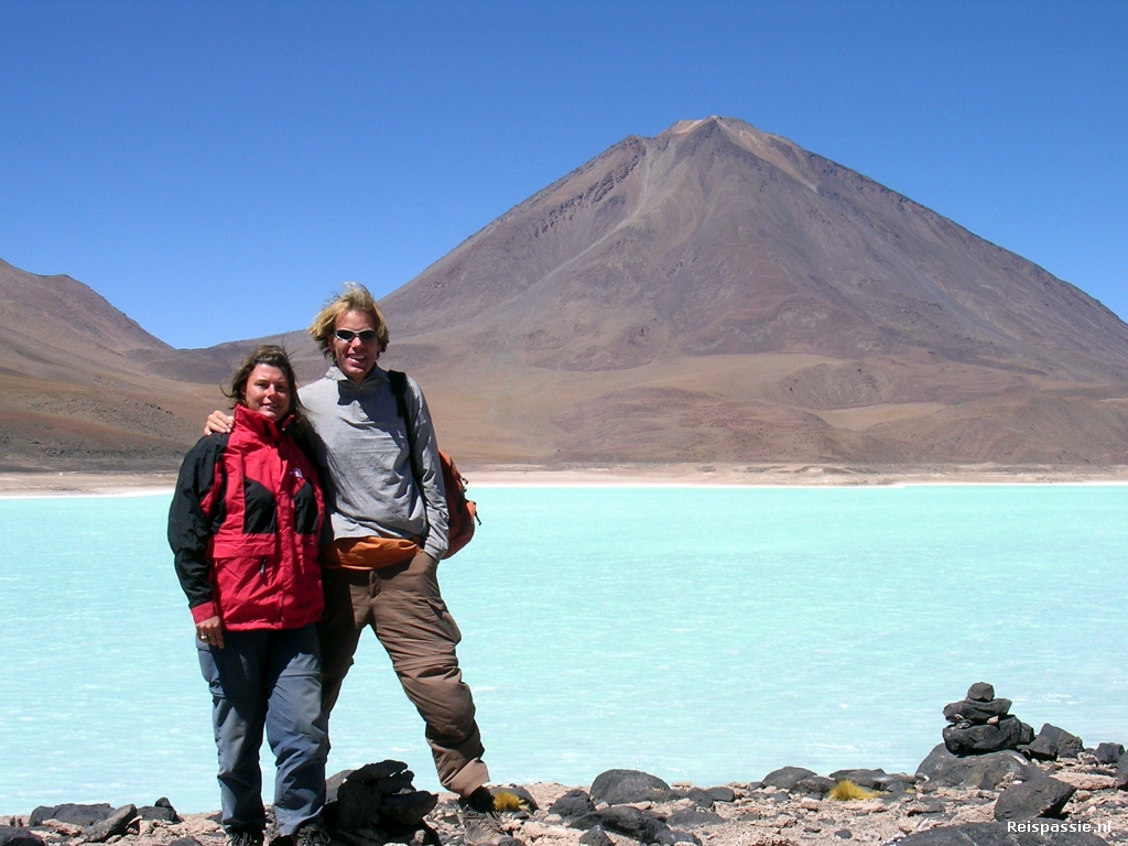 We rijden met een grote boog om de Llicancahur vulkaan heen. Het is dezelfde vulkaan die ook al in San Pedro zo prominent aanwezig was. Het landschap is geweldig. Heel ruig met af en toe wat lage struikjes en vicunas (een klein soort wilde lama's) die lopen te grazen. De kleuren zijn geweldig. De bergen zijn tot boven getooid in alle tinten rood en geel alsof iemand er emmers verf over heeft leeggegoten. De eerste stop is na een drie kwartier bij Laguna Verde. Dit gifgroene meer ligt prachtig aan de voet van, nog steeds, de Llicancahur vulkaan. Inmiddels zitten we al op 4600 meter hoogte. Vervolgens doorgereden door weer wereldse landschappen. Een gedeelte wordt het Salvador Dali dal genoemd omdat de rotsen die omhoog steken lijken op een schilderij van Dali en de omliggende gekleurde bergen zien er uit als een schilderspalet. De reden dat de bergen en meren hier zo gekleurd zijn is de aanwezigheid van allerlei mineralen en chemicalien die de kleuren afgeven.