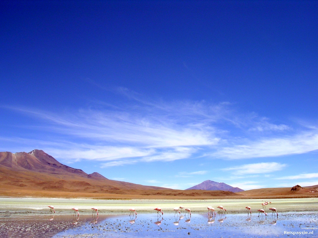Vervolgens belanden we bij een verzameling meren. De lagunas Hedionda, Canapa en Chiarcota. Het zijn fel gekleurde meren met witte randen. Ze zijn heel ondiep en zitten vol flamingo's. In tegenstelling tot gisteren zitten deze langpoten nu vlak bij de kant en kunnen we mooi foto's maken. Ze hebben prachtige rode en roze veren en weerspiegelen in het water als ze statig in het rond stappen. Wat later zien we ook nog een paar kleine knaagdieren die lijken op een soort kruising tussen een eekhoorn, konijn en een kleine kangaroe. Ze zitten tussen de rotsen die als een eilandje in de zandvlakte liggen. Toch weer bijzonder om te zien hoe deze beestjes kunnen overleven in een omgeving waar bijna niets groeit.