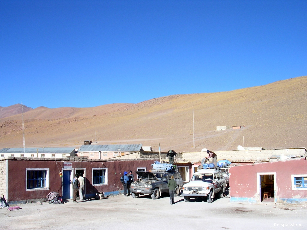 Deze grensovergang tussen Chili en Bolivia schijnt een van de meest afgelegen in Zuid Amerika te zijn. Het stelt dan ook niet heel veel voor. Een klein gebouwtje en een slagboom, that's it. Er staan hier verscheidene landcruisers te wachten van de verschillende toertjes. We halen bij een norse Boliviaan in het gebouwtje onze stempel en verzamelen dan bij "onze" landcruiser. Hier ontmoeten we Clemente, hij is voor de komende dagen onze chauffeur. Het is een heel aardige en rustige man van een jaar of vijftig. Het is dan eerst tijd voor ontbijt. Onze trip is heel compleet; eten, drinken, accommodatie en entreegelden van de nationale parken, het is allemaal inbegrepen. En dat voor maar 65 dollar. De auto is er weer eentje van het type met veel levenservaring maar hij ziet er nog vrij redelijk uit. Eens kijken of ie ook blijft rijden.