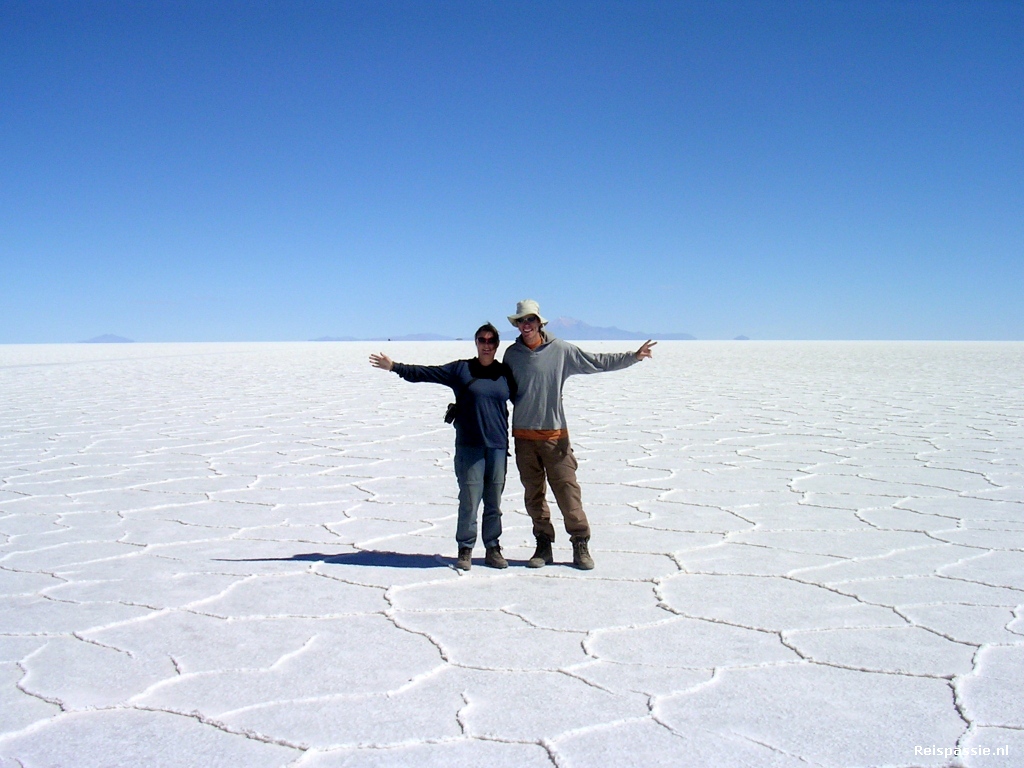 Dag drie kunnen we wat langer slapen want het is niet zo'n lange afstand die vandaag moet worden afgelegd. Na het ontbijt onder alweer een strakblauwe hemel weggereden. Na een minuut of tien bij de zoutvlakte. Zover je kan kijken een hagelwitte vlakte. De Salar de Uyuni. We rijden een stuk over de vlakte en stoppen dan voor wat foto's. Je hebt continu het idee dat je op het ijs rijdt. Een zonnebril is noodzaak want het licht is geweldig fel. Nadat het laatste water uit de regentijd is opgedroogd zijn prachtige patronen achtergebleven. Het is een enorme vlakte. Dit zoutmeer is het grootste ter wereld, in het midden is de laag zout zo'n 10 meter dik!