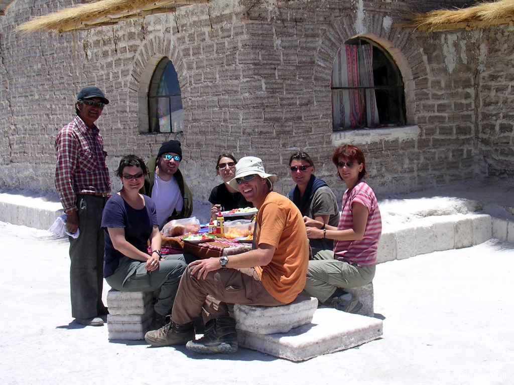 Dan weer verder gereden over de vlakte. Bij een ander zouthotel gelunched, lekker buiten op de vlakte aan een zouttafel. En maar blijven smeren tegen de zon.