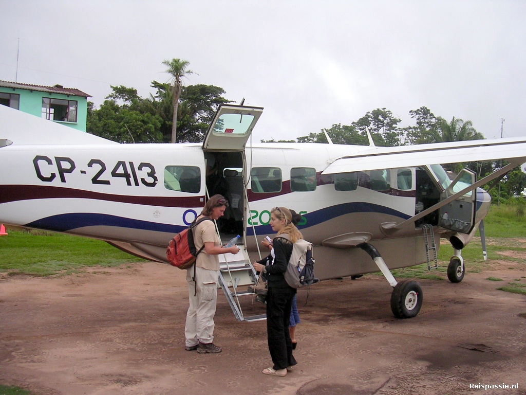 Het is een uur vliegen naar Rurrenabaque. Het vliegveld is een grasbaan met een klein hutje ernaast wat dienst doet als wachtruimte. Zodra je uitstapt voel je de klamme warmte van het regenwoud. Het is hier ook weer zo'n 2500 meter lager dan een uurtje geleden. We gaan met minibusje naar het dorp en melden ons bij het kantoortje van de organisatie waar we mee meegaan. Daarna een rondje door het dorp gelopen op zoek naar accommodatie. Het is een dorpje van niets maar het heeft toch aardig wat hostels en restaurantjes door de vele mensen die hier komen om een trip naar de pampas of jungle te maken. In "Tucanes de Rurrenabaque" een kamer genomen. Het is een fraai hostel met veel zitjes in de schaduw en heel wat hangmatten. Lekker dus om nog wat te hangen voor we morgen op pad gaan.