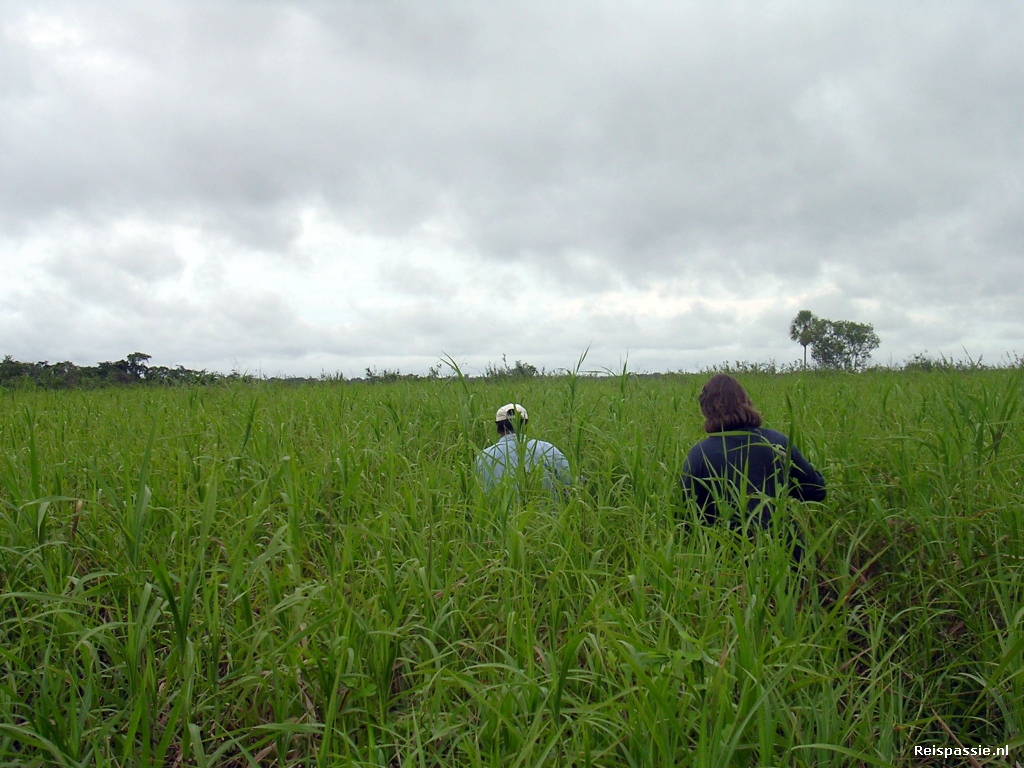 Vandaag gaan we de pampas zelf op. Lopen dus door het hoge riet op zoek naar anaconda's. We varen eerst een stukje en gaan dan het riet in. Het is bijna twee meter hoog en heel dicht. De gids baant een pad op weg naar wat het oneindige lijkt. Gelukkig staat het water niet al te hoog al worden je schoenen en broek uiteraard wel nat. Het is minder warm dan gisteren want het is nu veel bewolkter. Jammer genoeg is dit wel ten nadele van onze anaconda zoektocht want ze laten zich bij weinig zon veel minder zien volgens de gids. We lopen uren langs dampende moerassen en door de rietvelden. Veel vogels, de gids vindt nog een schedel van een van de enorme ooievaar achtige vogels. Het is een snavel van wel een centimeter of zestig. Maar geen anaconda's, hoewel Sabina erg z'n best doet en nog veel meer dan ons door het riet struint om er een te vinden. Het zit er niet in vandaag. We gaan terug naar de kano en varen weer naar het kamp. Hier weer een uitgebreide lunch waarna een anderhalf uur siesta.