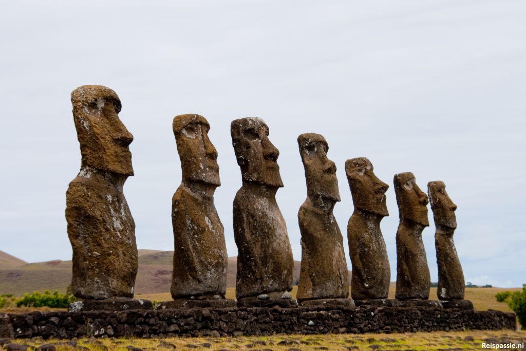 En dan het eiland op, op zoek naar de Moai. Tenslotte is Paaseiland vooral bekend vanwege de honderden imponerende beelden, die rondom het eiland langs de kust staan. Sommige van deze eeuwen oude beelden zijn zo groot, dat het een mysterie is hoe ze gemaakt, vervoerd en opgericht zijn. Ze staan op ceremoniële terrassen, de ahu’s, die speciaal voor de beelden waren aangelegd. Er zijn ongeveer 240 van die platforms en van de 887 moai die Paaseiland telt, hebben er 288 hun bestemming bereikt. 92 beelden zijn onderweg gestrand en bijna de helft - 397 beelden - heeft nooit de groeve verlaten waar ze uit de vulkanische steen werden gehakt. De grootte varieert nogal. De meeste zijn van een paar meter hoog tot een meter of zes, zeven. Onbegrijpelijk hoe ze die ooit op hun plaats hebben gekregen.