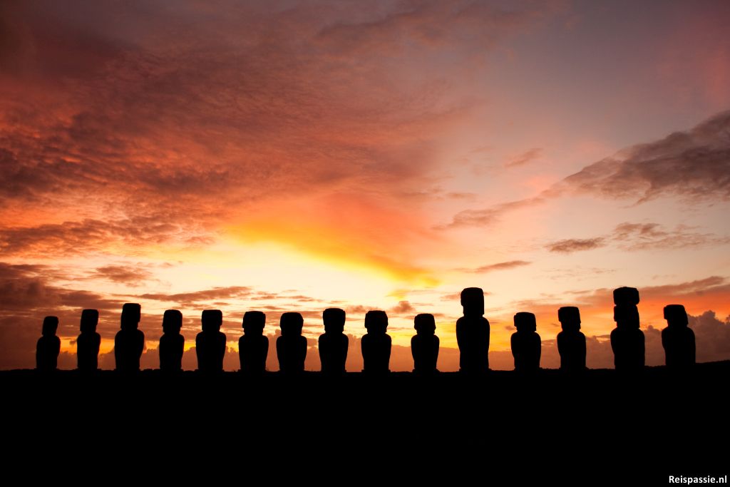 Helaas zit het weer niet echt mee. Afgelopen dagen was het stralend, vandaag is het grotendeels bewolkt. Tijdens onze lunch-stop op het enige zandstrand van het eiland begint het enorm te regenen. Het is maar een paar minuten maar we zijn kompleet doorweekt. Gelukkig blijft het verder wel droog dus de kleren zijn ook zo weer droog. 's Avonds de zonsondergang bekeken bij een groep moai even buiten het dorp en de volgende ochtend al weer vroeg op pad met het scheurijzer om de zonsopkomst te zien bij de grootste groep beelden heel aan de andere kant van het eiland. In beide gevallen een prachtig gezicht om de silhouetten van de moai tegen de gekleurde hemel te zien.