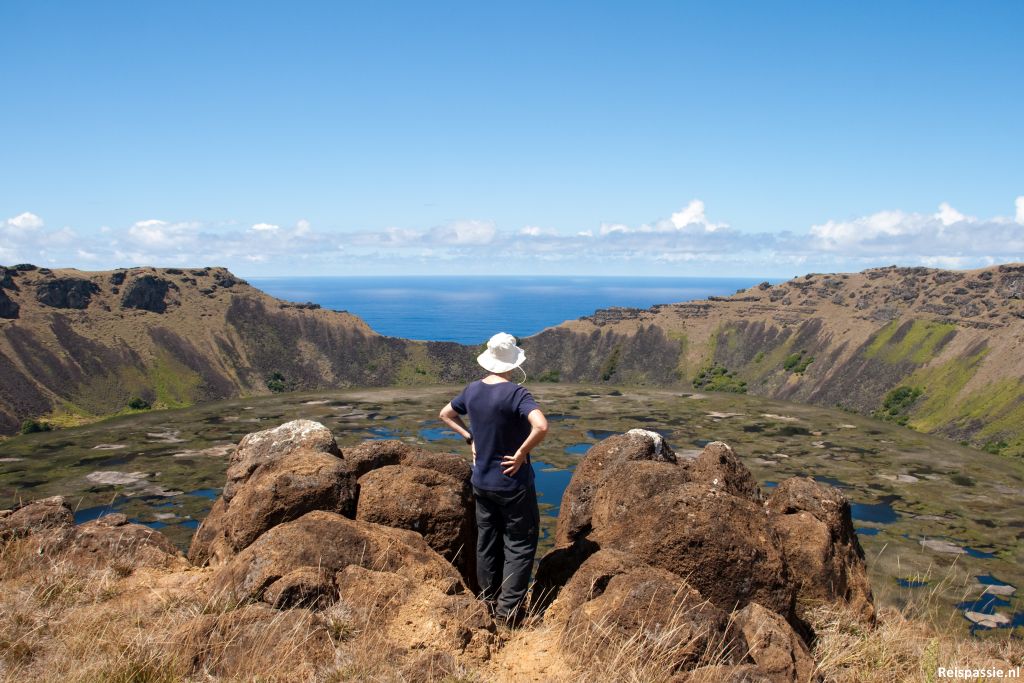 De Ranau Kau ligt redelijk dicht in de buurt van het dorpje Hanga Roa waar we verblijven. Deze voormalige vulkaan is hoog genoeg om een mooi uitzicht over het eiland te geven en heeft nog een fraai kratermeer ook. Dus de schoenen aan en omhoog! Eerst langs het haventje, een man wenkt ons en laat trots z'n vangst van vanmorgen zien. Het is een enorme tonijn. Althans enorm in onze ogen. Hij heeft ze nog veeel groter gevangen, zegt ie...