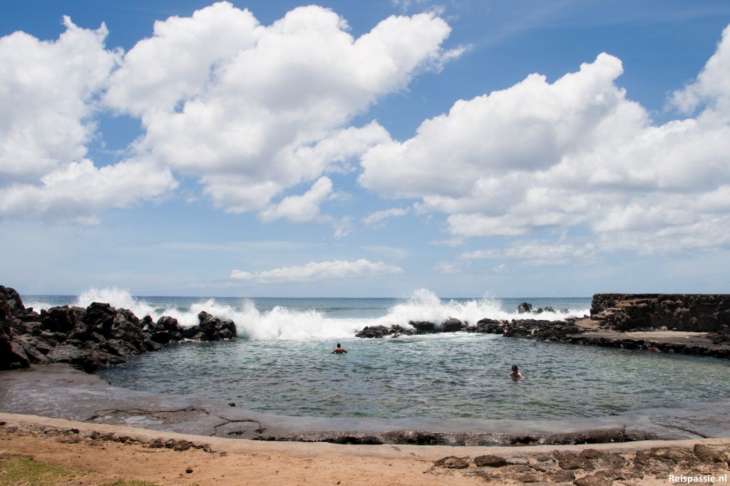 De volgende ochtend is het rustig..., heel rustig. Alles en iedereen heeft wat te verwerken. Het is alweer een stralende dag. Helderblauw en een lekkere verkoelende wind. In de middag naar de andere kant van het dorpje gelopen waar ook wat Moai te zien zijn. Daarna naar een zwembaaitje gegaan. Het heeft een beschermende rand met rotsen om de enorme golven buiten te houden. Evengoed kan je de stroming door de golven nog goed voelen. Heerlijk liggen relaxen onder de palmbomen.