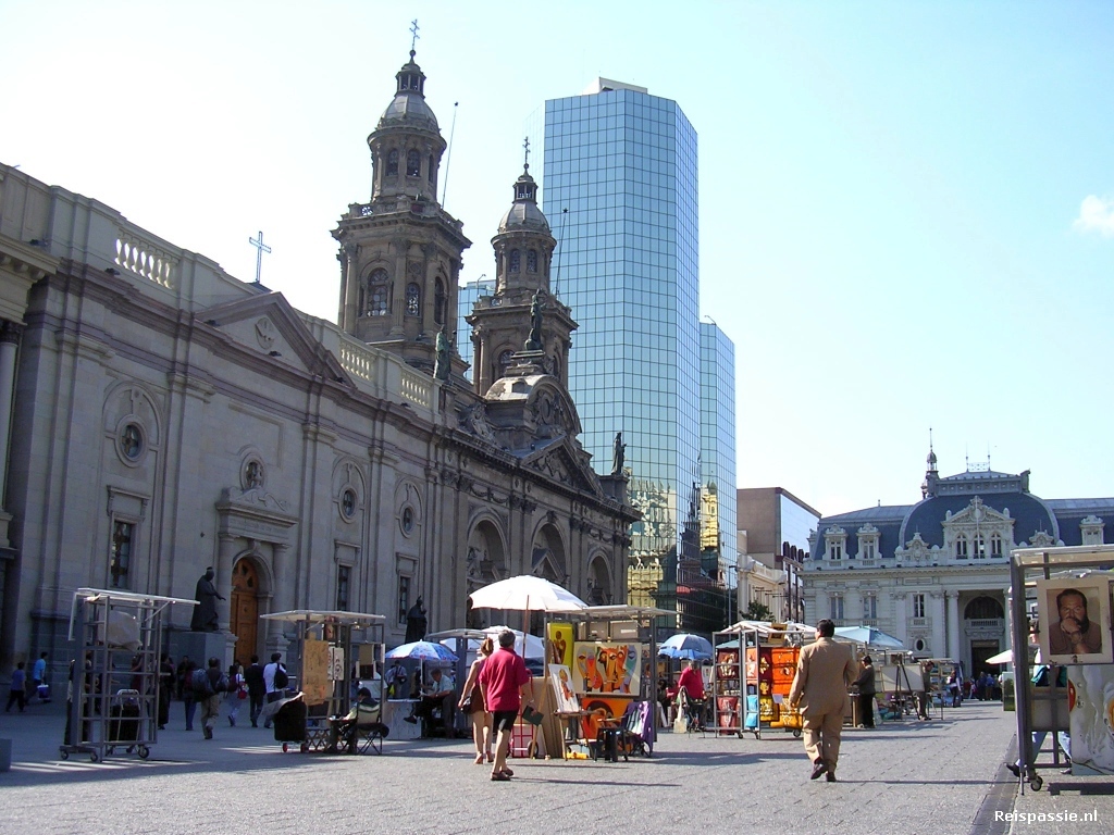 Santiago is een moderne stad met een beetje historische gebouwen. Het is er druk met heel veel bussen en een flinke smoglaag die de blauwe hemel net iets minder blauw maakt. We maken de stadswandeling uit de reisbijbel, langs alle mooie en minder mooie historische gebouwen. Midden in de stad ligt het Plaza de Armas. Een plein met bomen en en heleboel bankjes. Het wordt een soort vaste stop op de wandelingen door het centrum. Even lekker hangen op een bankje onder een boom en kijken naar het Chileense dagelijkse leven.