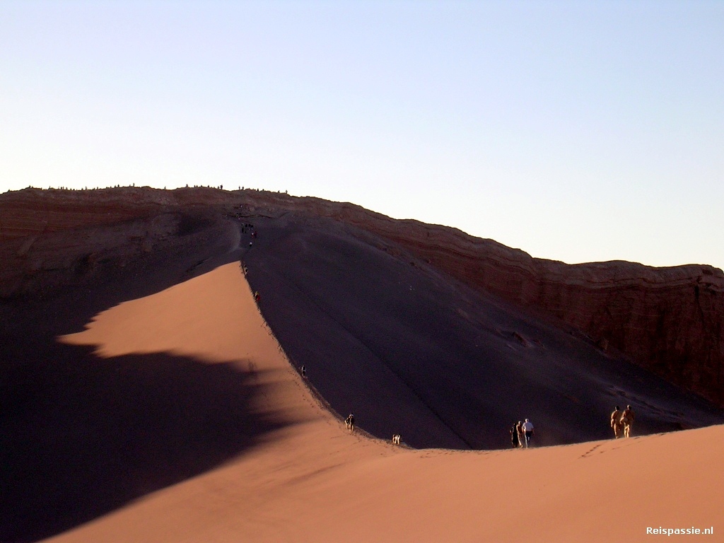 En we zijn niet de enige, tientallen busjes staan aan de voet van het duin en een grote hoeveelheid mensen is al aan het klimmen. Nooit gedacht dat er zoveel toeristen in San Pedro zaten. Een rustige romantische zonsondergang zit er dus niet in, maar hij zal er niet minder mooi om zijn. We klimmen eerst tegen het enorme duin op en wandelen vervolgens over de kam naar de rotsen aan de andere kant. Als we aan de overkant zijn zakt de zon op z'n laagste punt. De hele omgeving kleurt nu paars/roze en de grote vulkaan in de verte lijkt net een omgekeerde suikerspin. Prachtig om te zien.