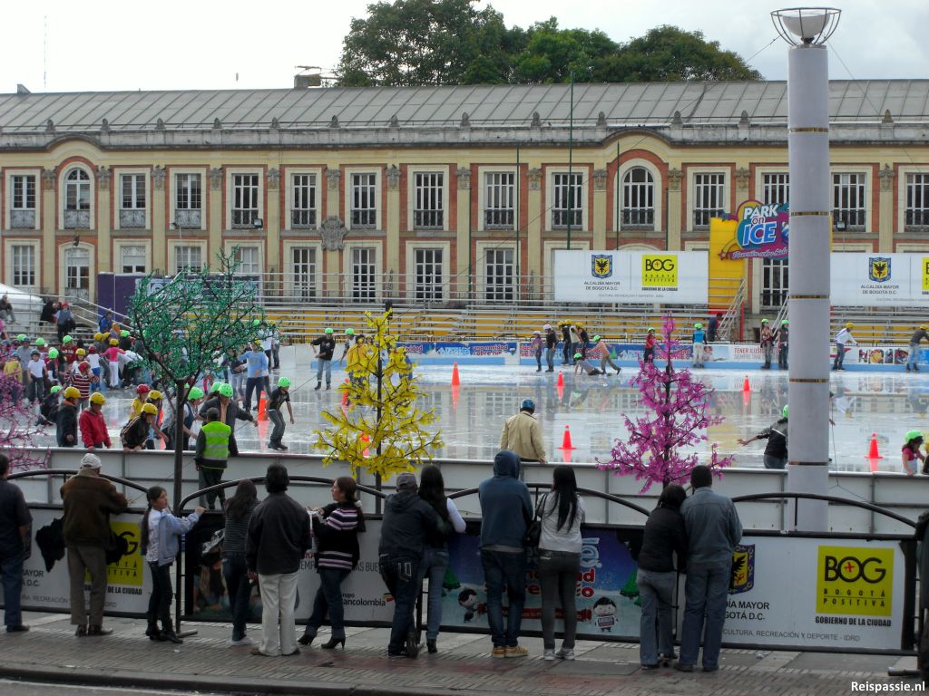 De rest van de dag het centrum van Bogota bekeken. Heel verrassend, op het Plaza Bolivar kan je hier schaatsen! Op echt ijs en niet eens een lullig baantje ook. Het is hier ook helemaal niet warm (een graad of 15) want Bogota ligt maar liefst op 2600 meter hoogte. Dus op voor onze eerste schaats-hoogtestage. In Colombia nog wel! Maar dat hadden we gedacht. Voor de locals is dit natuurlijk iets heel bijzonders en er staat echt een MEGA rij te wachten om de baan op te mogen. Dus maar even niet. Maar het is al vermakelijk genoeg om die gasten na een paar meter geweldig op hun plaat te zien gaan.