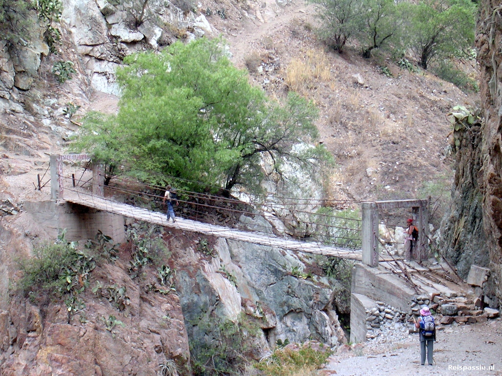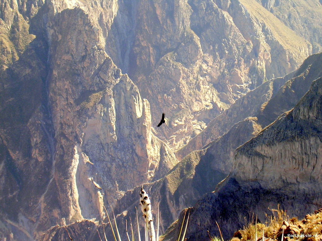 In Chivay vijf minuten sanitaire stop en dan weer dik twee uur onverhard en dus al stuiterend tot Cabanaconde. Hier rollen we lekker geklutst de bus uit en is het eerst maar eens tijd voor lunch. En dan eindelijk de canyon in, daar zijn we tenslotte voor gekomen. Het is (uiteraard) eerst afdalen. In totaal een uur of vier naar beneden. Deze canyon is een van de diepste ter wereld. Op het diepste punt 3191 meter. De allerdiepste ligt aan de andere kant van de bergrug, dit is de Cotahuasi die nog 163 meter dieper is. De afdaling gaat langs steile basaltwanden maar het pad is over het algemeen vrij eenvoudig begaanbaar. Af en toe zien we al condors vliegen hoog boven ons in de canyon. Als kleine stipjes tegen de grijze wolken.