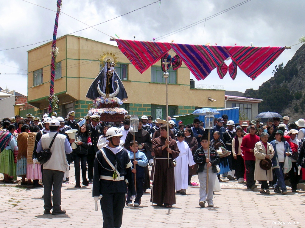 Vlak voor we weggaan trekt er nog een fanfare door het dorp. Het blijkt een parade van de plaatselijke marine te zijn. Hoewel Bolivia natuurlijk nergens aan zee ligt heeft het toch een marine om de belangen op het Titicaca meer te verdedigen. En die marine is dus gezeteld in Copacabana. En vandaag is het feest, de straten waar de stoet doorheen gaat zijn versierd met een soort erebogen omwikkeld met de kleurige Boliviaans doeken en er hangen speelgoeddieren in. Voor in de stoet wordt een Mariabeeld op een soort draagbaar rondgesjouwd en een hoop mensen langs de kant gooien bloemenblaadjes als ze passeren. En verder volgt het hele regiment aan militairen in het ritme van de grote trom. Uiteindelijk gaat alles een aantal boten op en gaat uit varen op het meer. Kleurrijke vertoning.