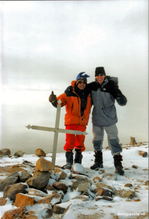 Eigenlijk toch nog onverwacht is hij daar opeens, de top! Eerst een kort wat vlakker stuk en dan opeens de kruizen en hopen gestapelde stenen op de echte top. Even dat geweldige euforische gevoel. Handen schudden en op schouders slaan en vooral even uithijgen. We hebben het gehaald! In een kleine zes uur naar 6090 meter!