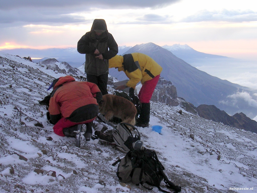 Het uitzicht van hierboven is geweldig, de Misti als meest dicht bijzijnde top in het ochtendlicht en al die toppen in de verte. Gelukkig sneeuwt het al even niet meer al is de wind nog bokkoud. Pogingen om met de digitale camera al dit fraais vast te leggen lopen op niets uit omdat de batterijen bij deze temperatuur al hun kracht verloren zijn. Er zit totaal geen leven meer in. Gelukkig zat er net nog genoeg in de spiegelreflex om wat foto's te maken, hopelijk is het wat. Overigens is een paar minuten pielen met een camera al weer voldoende om voor een half uur koude handen te krijgen dus hier ben ik ook heel snel klaar mee. Even nog genieten van het uitzicht en dan snel weer naar beneden. Op de een of andere manier had ik een beeld van wat langer relaxen op de top maar dat pakt dus wat anders uit.