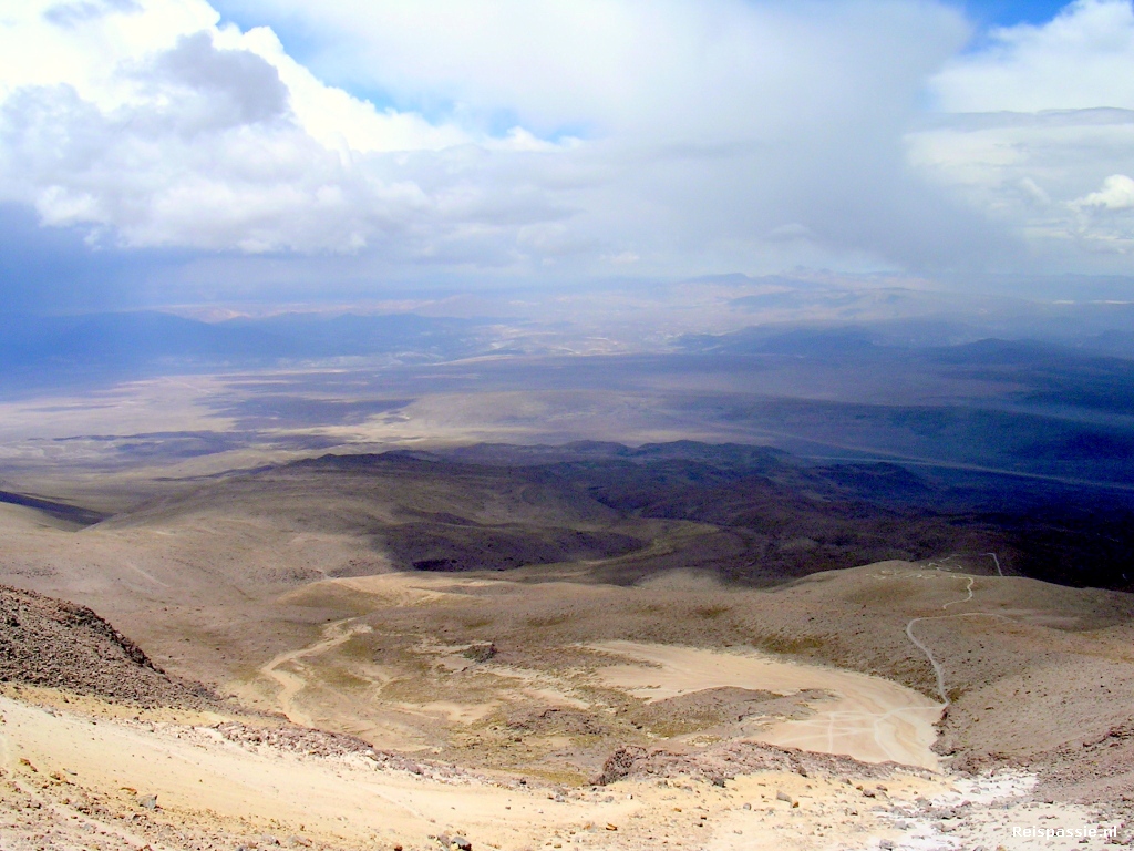 Het laatste stuk naar beneden tot de plek waar we opgepikt worden is net zo eenvoudig als omhoog. We roetsjen weer over de losse massa recht de helling af en zijn heel snel bij de pick-up plek. De auto is er nog niet en we moeten dus even wachten. Het uitzicht vanaf hier op het dal is ook geweldig. Je kan enorm ver kijken want het is nog steeds heel helder. Heel in de verte zien we het busje langzaam omhoog rijden. Het duurt nog zeker een half uur voor hij arriveert. De spullen ingeladen en dan bergafwaarts hobbelen. In twee uur weer terug in Arequipa. Alle geleende handel weer retour gebracht bij het buro en hier afscheid genomen van Ivan, Paul en Andrea. Moe maar voldaan terug naar het hostal. Een zesduizender op zak!