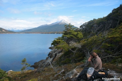 Op dit punt kijk je de Lapataia baai in. Prachtig uitzicht over het ruige landschap van Vuurland. De grens met Chili is hier een honderd meter verderop. Helaas is de verstandhouding tussen de twee landen in dit gebied nog niet zo goed dat je verder kan het Chileense deel in. Is nu “restricted area”. Maar voor ons is het hier ook wel genoeg voor vandaag. We hebben het wel gehad. We ploffen neer op een mooi stukje Patagonische grassen en wachten tot het busje ons weer oppikt.